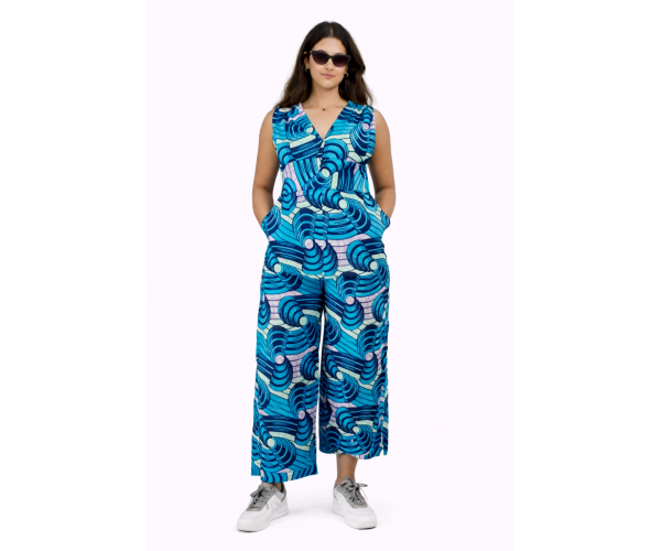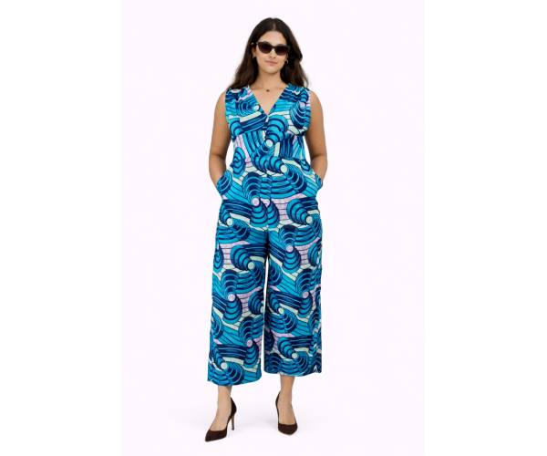 Magnifique combinaison en wax, tons chaleureux, motif cône, élastiquée à la taille.