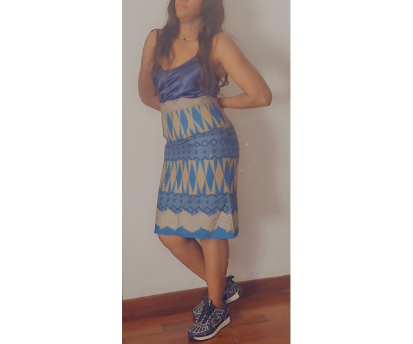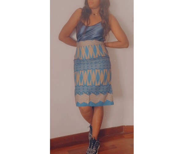 Magnifique jupe crayon bleu jaune imprimée wax motif triangle.
