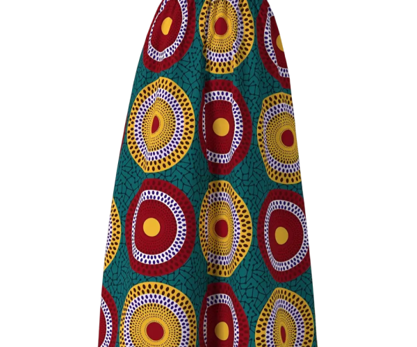 Magnifique jupe imprimée wax vert motif cercle multicolore jaune et rouge