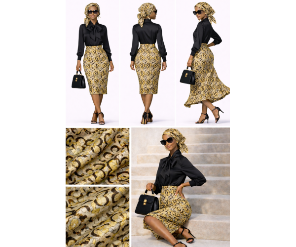 Belle jupe crayon en wax jaune , motif cœur noir, taille unique, élastiquée à la taille. Foulard intégré